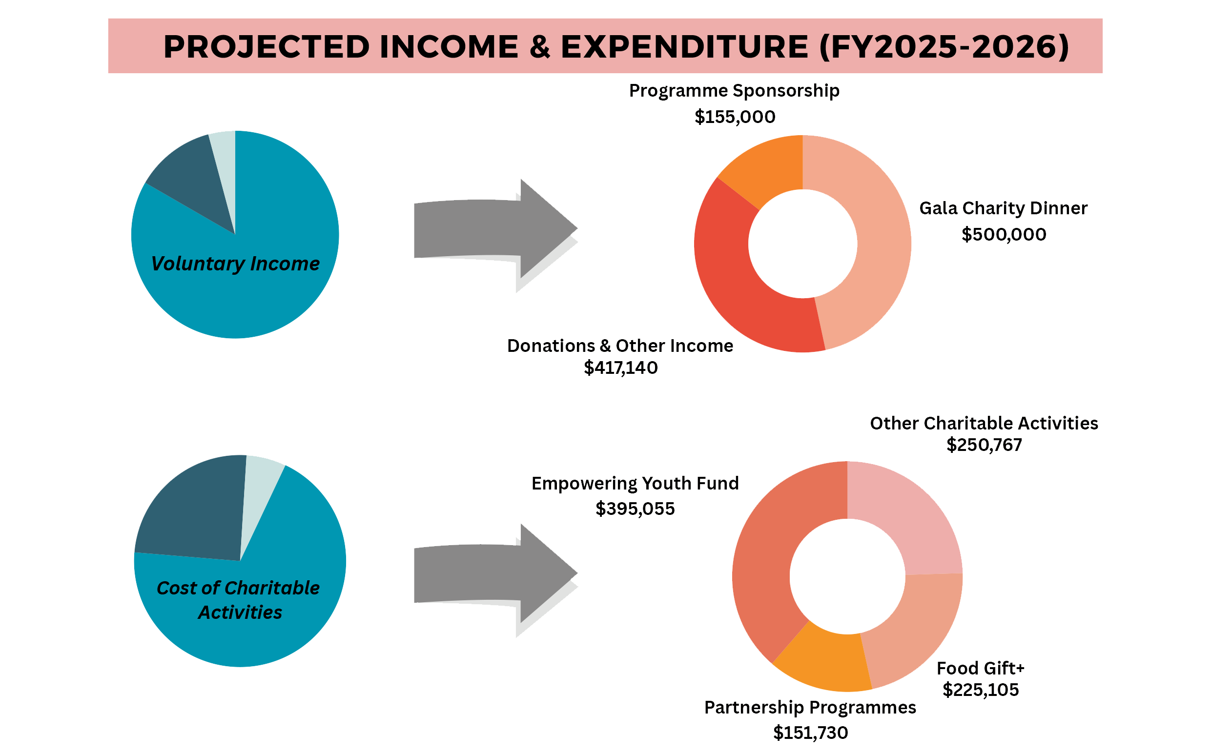 Our financial allocations reflect our commitment to impactful charitable programs and activities. The majority of our expenditures will continue to be directed towards our core services, including the Food Gift+ Programme, various Partnership Programmes, and the Empowering Youth Fund (EYF).